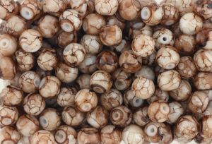 These round spun glass porcelain beads make a lovely choice for rosaries and jewelry. Each bead is unique in the pattern and assortment of varying shades of aqua blue and light tan with black marbling. Beads are 8 mm in diameter and are sold in pkgs of 60.