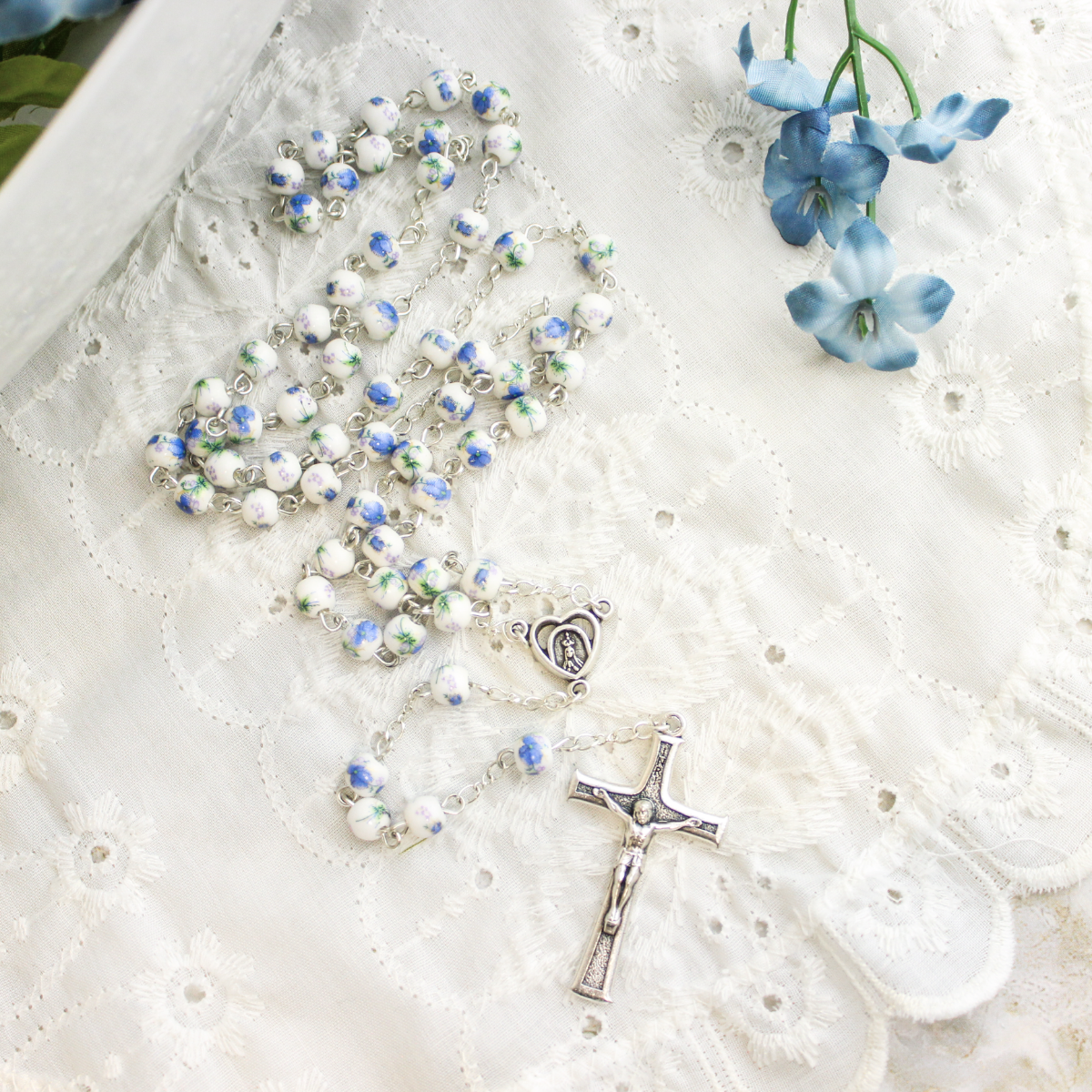 This hand painted ceramic bead rosary is beautifully detailed with 6mm blue and white glass beads. The center piece and crucifix feature Our Lady of Fatima. It is silver oxidized and made with durable locked link construction for extra strength. Measures 19 1/2 inches and is made in Portugal.