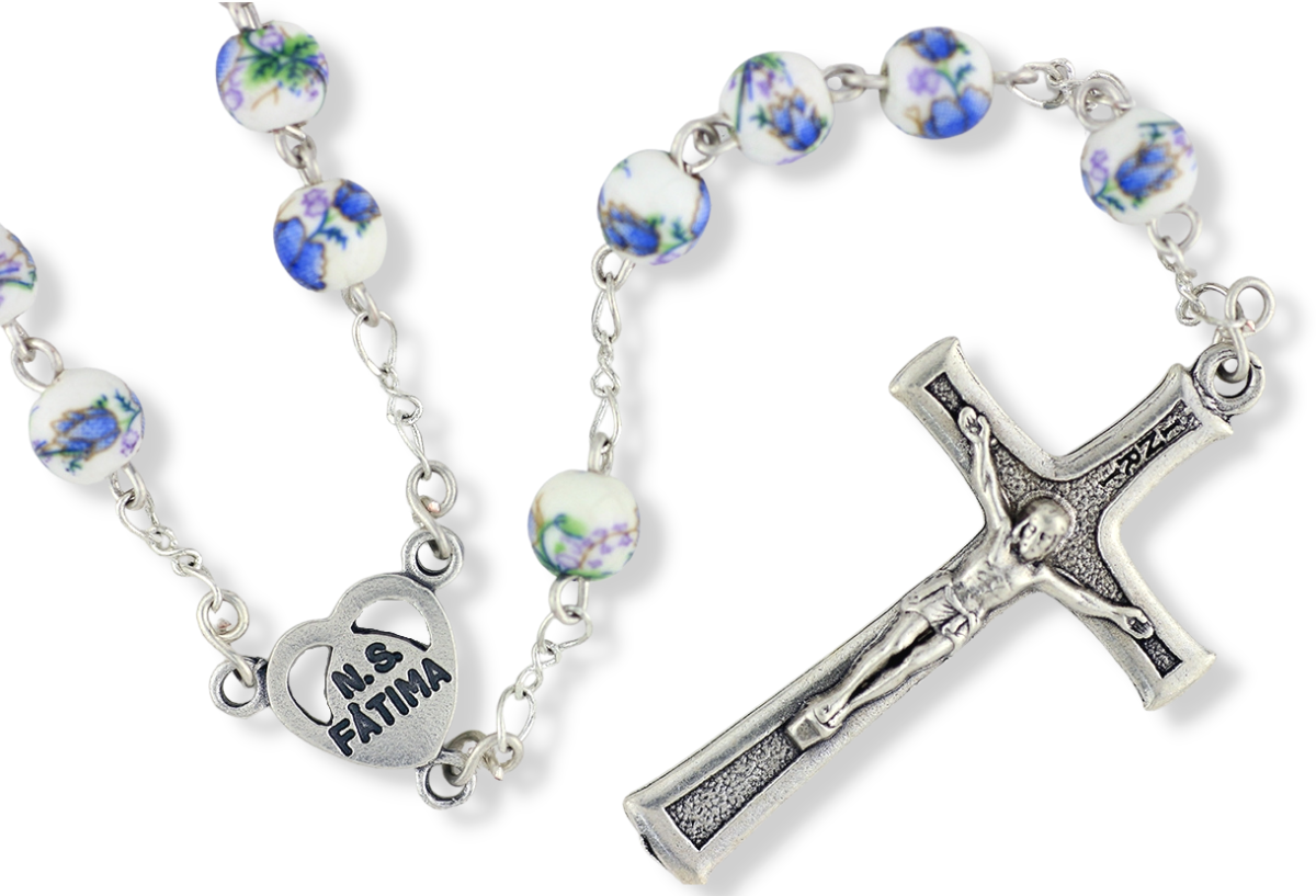 This hand painted ceramic bead rosary is beautifully detailed with 8mm blue and white glass beads. Featuring a Our Lady of Fatima center piece with a textured detailed crucifix. Made with silver oxidized medal and durable locked link construction for extra strength. Measures 20 inches in length and made in Portugal.