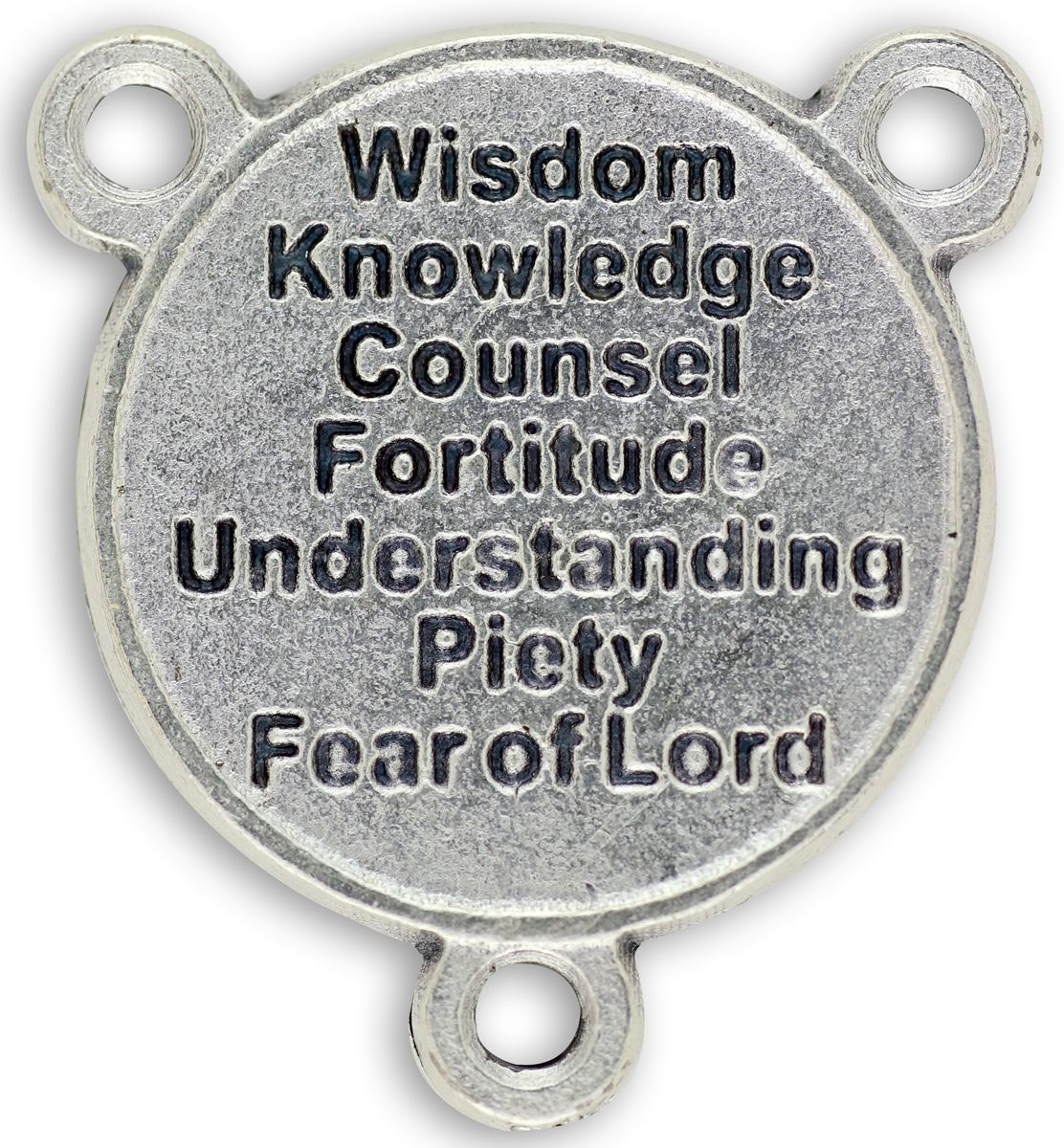 This two-sided centerpiece features a dove signifying the Holy Spirit on the front. The seven gifts of the Holy Spirit are engraved on the back: Wisdom; Knowledge; Counsel; Fortitude; Understanding; Piety; and Fear of the Lord. Made in Italy, this rosary center piece has a silver-oxidized finish adding depth and intricate detail. This centerpiece measures one inch and is made in Italy.