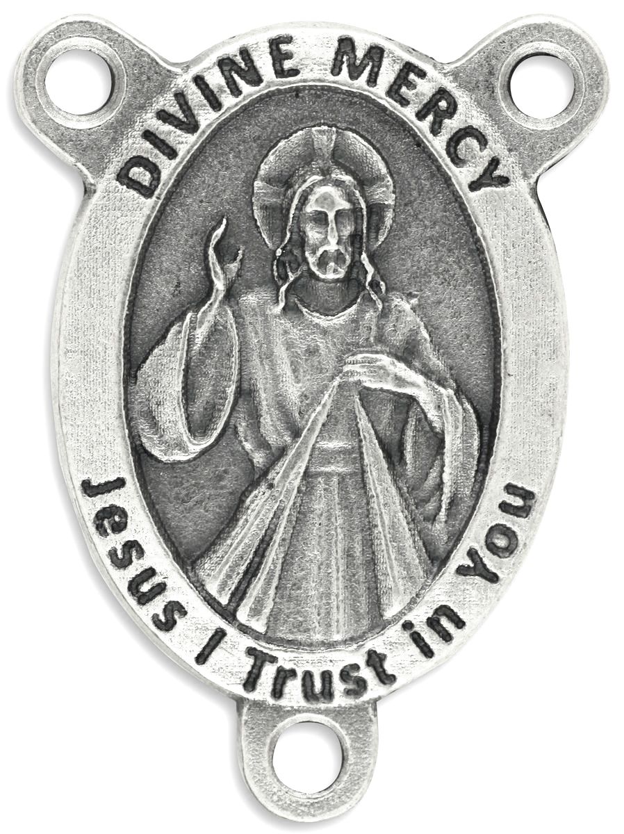 This Divine Mercy / St Faustina centerpiece is oval shaped and silver oxidized. The Divine Mercy is a Catholic devotion focused on the mercy of God, particularly as a form of thanksgiving and entrustment to God. It can be traced back to St. Faustina Kowalska a polish nun, and is based on the bible verse: Ask and it shall be given to you; seek, and ye shall find; knock and it shall be opened to you. In that anyone who seeks God’s mercy shall not be turned away. St. Faustina said that Jesus in speaking to her requested that she commission a picture of him with the words Jesus I Trust In You.