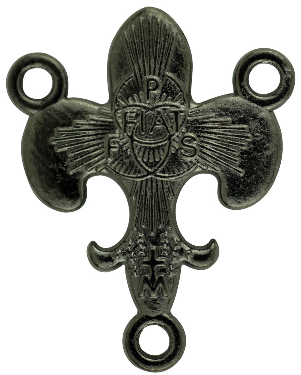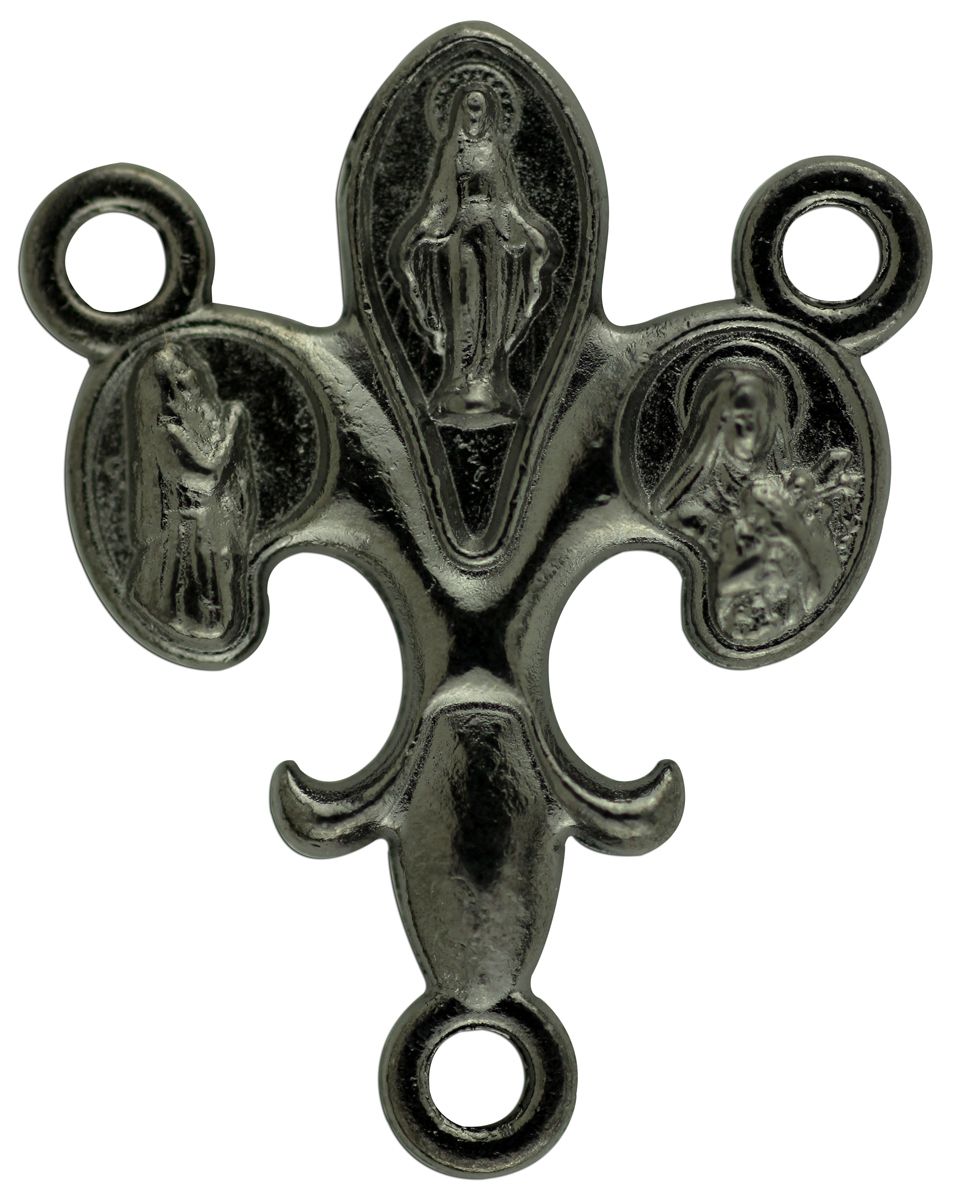 This truly unique fleur-de-lis shaped rosary center piece features the Miraculous Medal image of Mary surrounded by St. Bernadette and St. Therese of Lisieux. The reverse of the centerpiece features the Trinity and the word "Fiat" referencing Mary's "yes" to God on top of the back of a Miraculous Medal. Rich in Catholic tradition, the Fleur-de-Lis is woven throughout Christian history. One interpretation of the three leaves of the "Flower of the Lily" is that it represents the Holy Trinity. This large centerpiece measures 15/16" in height. Gun metal finish and made in Italy.