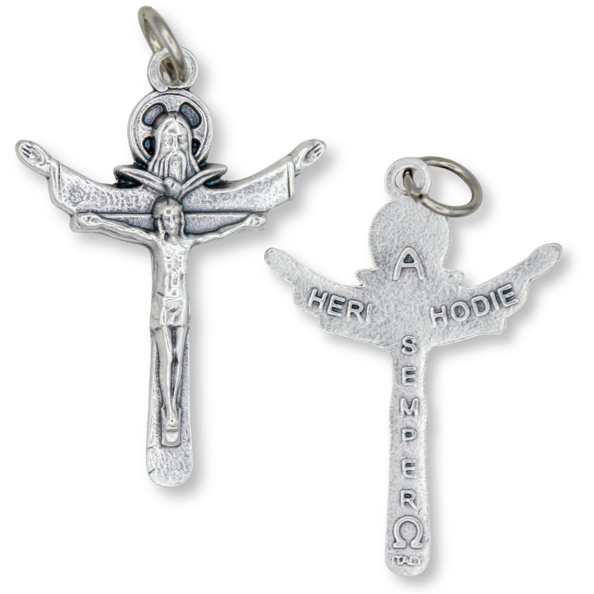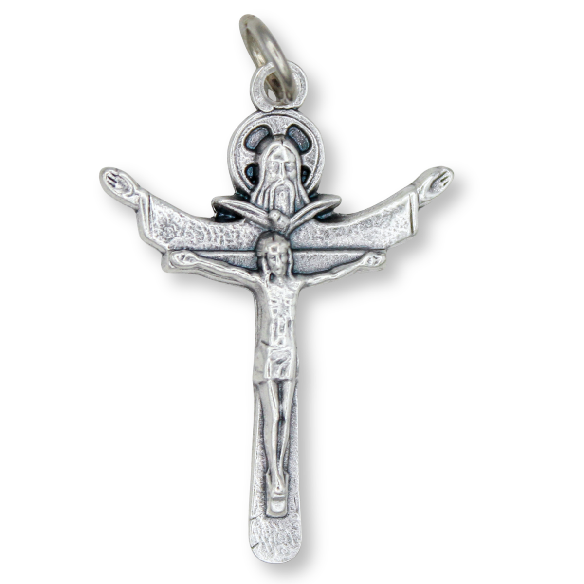 This beautiful Holy Trinity crucifix features an ornate design and small in size. Above the crucified Jesus is the Holy Spirit in the form of a dove and behind that is God the Father.