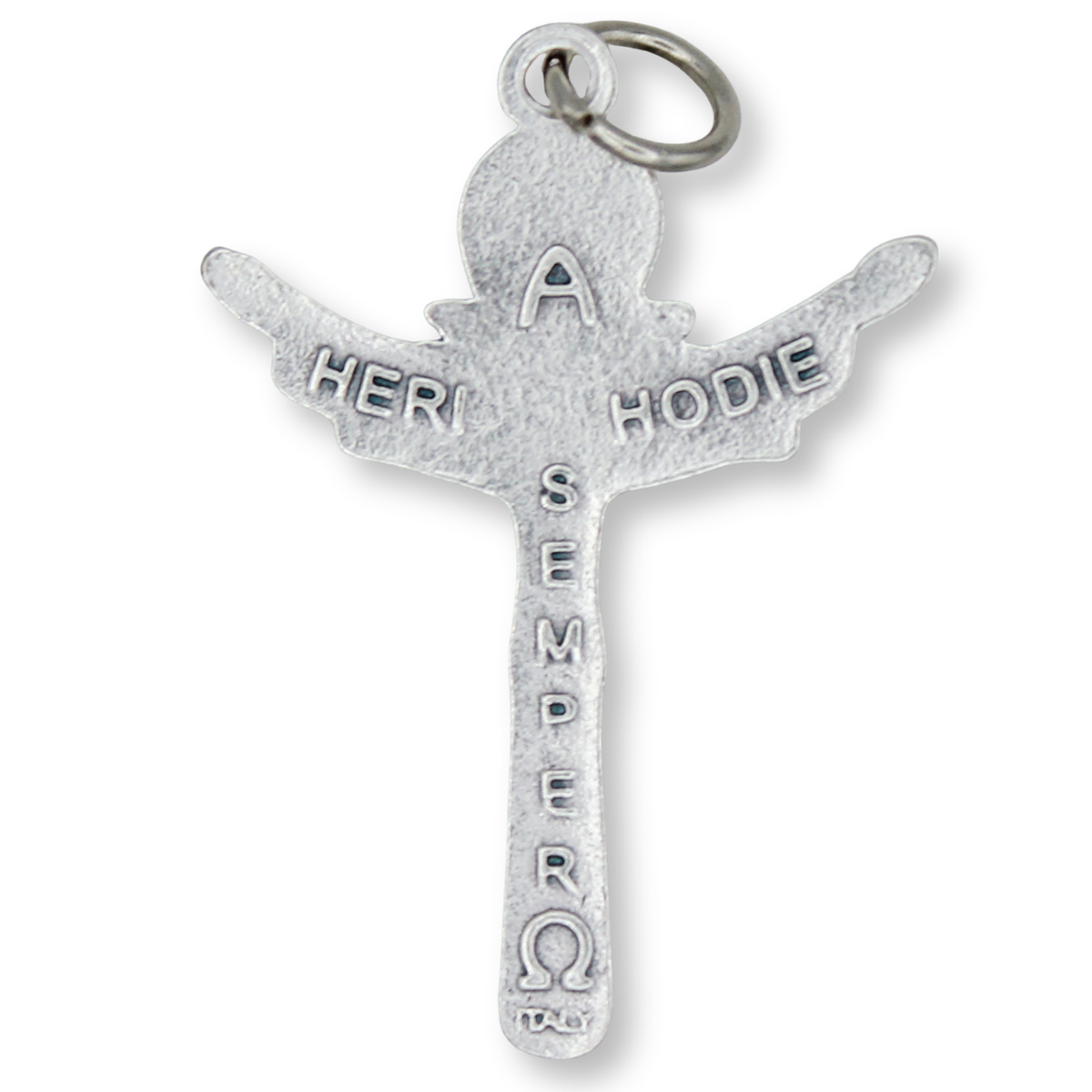 it remarks that "Jesus Christ is the same forever". This crucifix is die-cast and silver oxidized for a rich dimensional finish as only the Italians have perfected. Made in Italy. Approximately 1 3/8 inches in height,