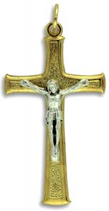 This beautifully detailed, 2 piece crucifix features a silver oxidized cross with a gold plated corpus. The corpus and cross are separately die cast, plated, then attached in a third operation, making this crucifix extremely detailed and realistic. Made in Italy. This crucifix is 2 1/4" in length and approximately 1" in width. It is a replica of Saint John Paul II and Pope Benedict XVI's staff. Made in Italy.