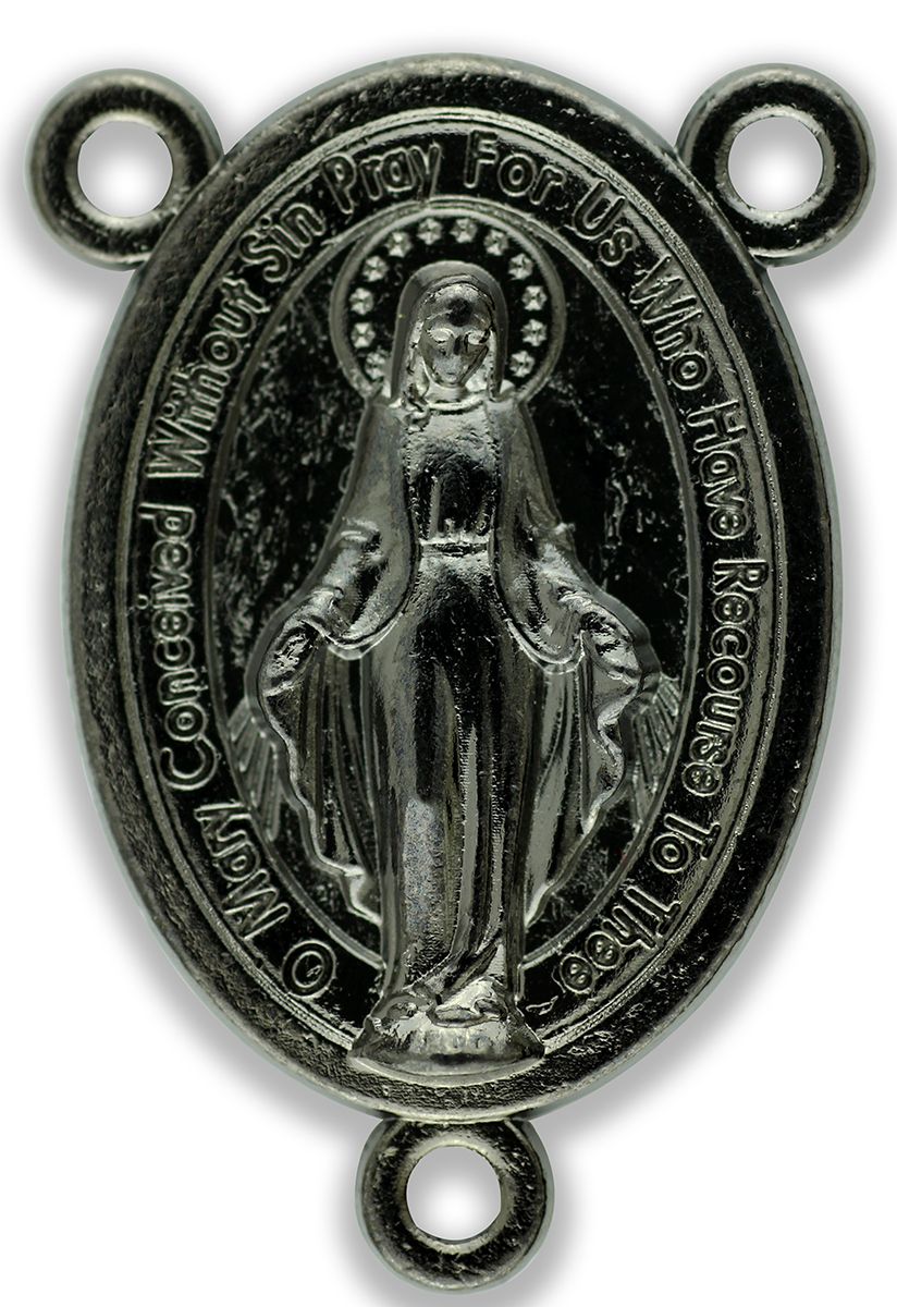 This beautifully detailed, oval Miraculous Medal rosary centerpiece measures 1 inch (2.5 cm) in height - perfect for medium to larger sized rosaries. As the picture tells only part of the story, this center is meticulously detailed - it is die cast and silver oxidized in Italy, and the best quality miraculous center we have seen! Known as the Medal of the Immaculate Conception, it was created by St. Catherine Laboure following a vision of the Blessed Virgin Mary. This medal is believed to bring special intercessions on behalf of the Blessed Virgin Mary if worn with faith and devotion at the hour of death.