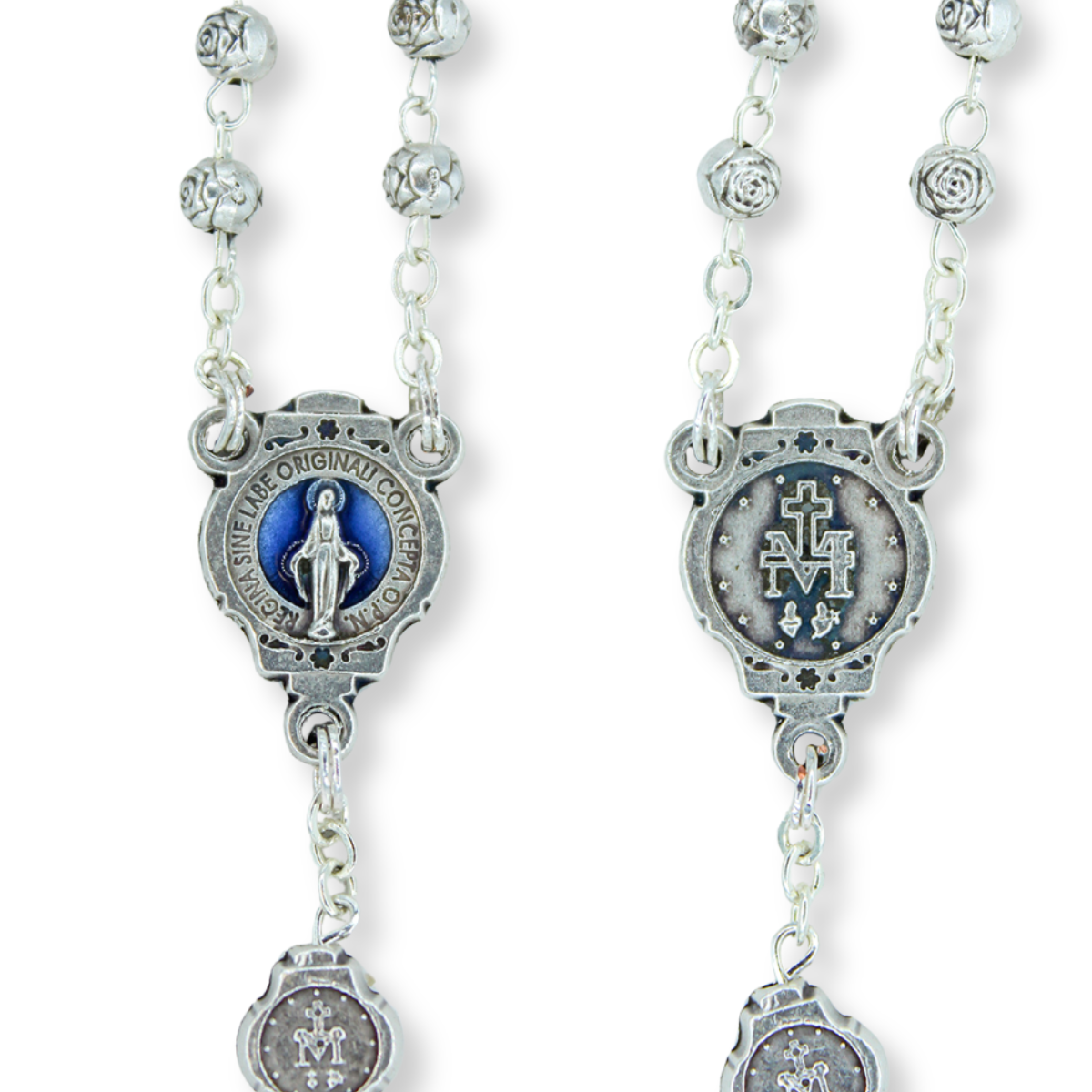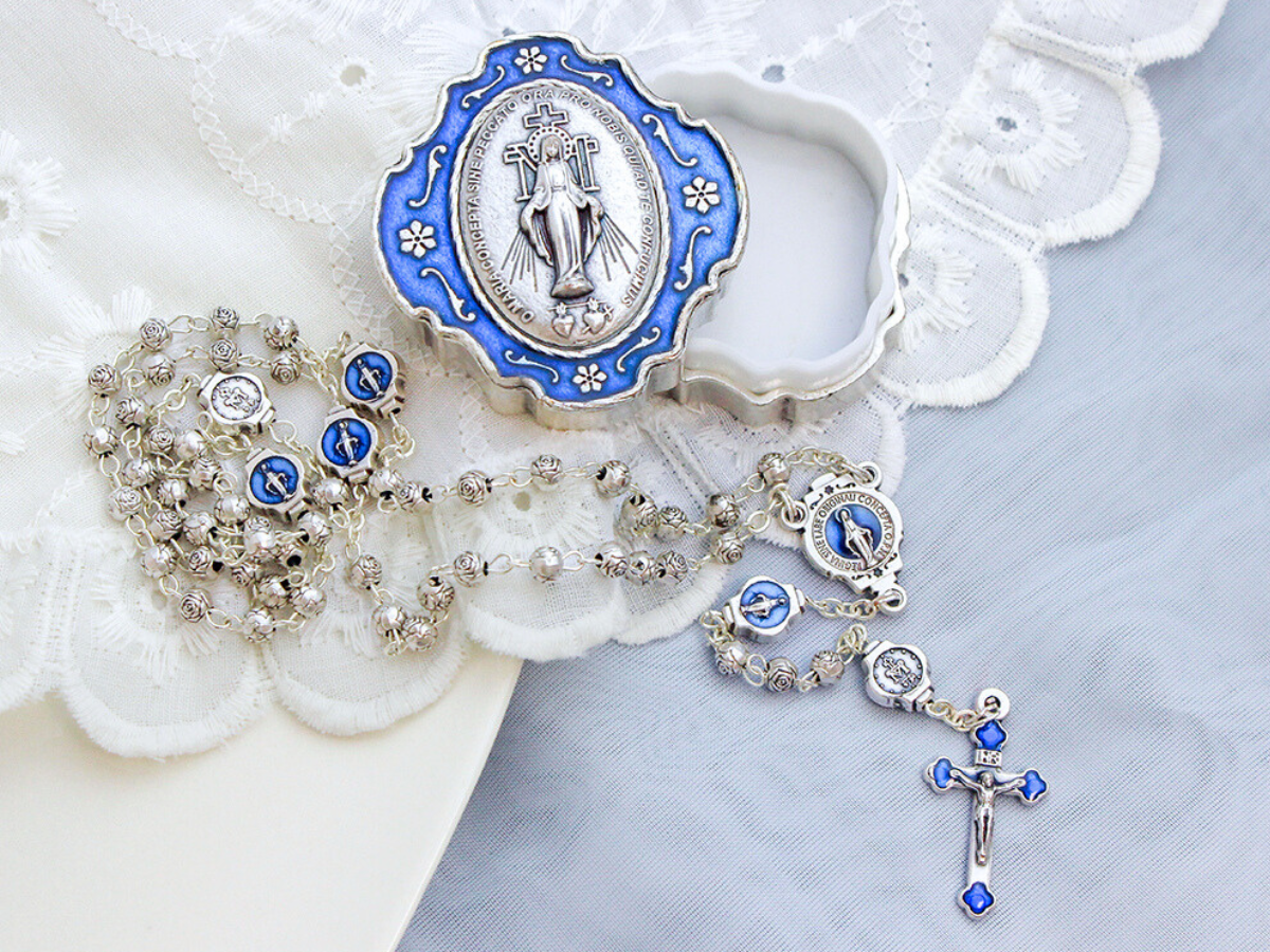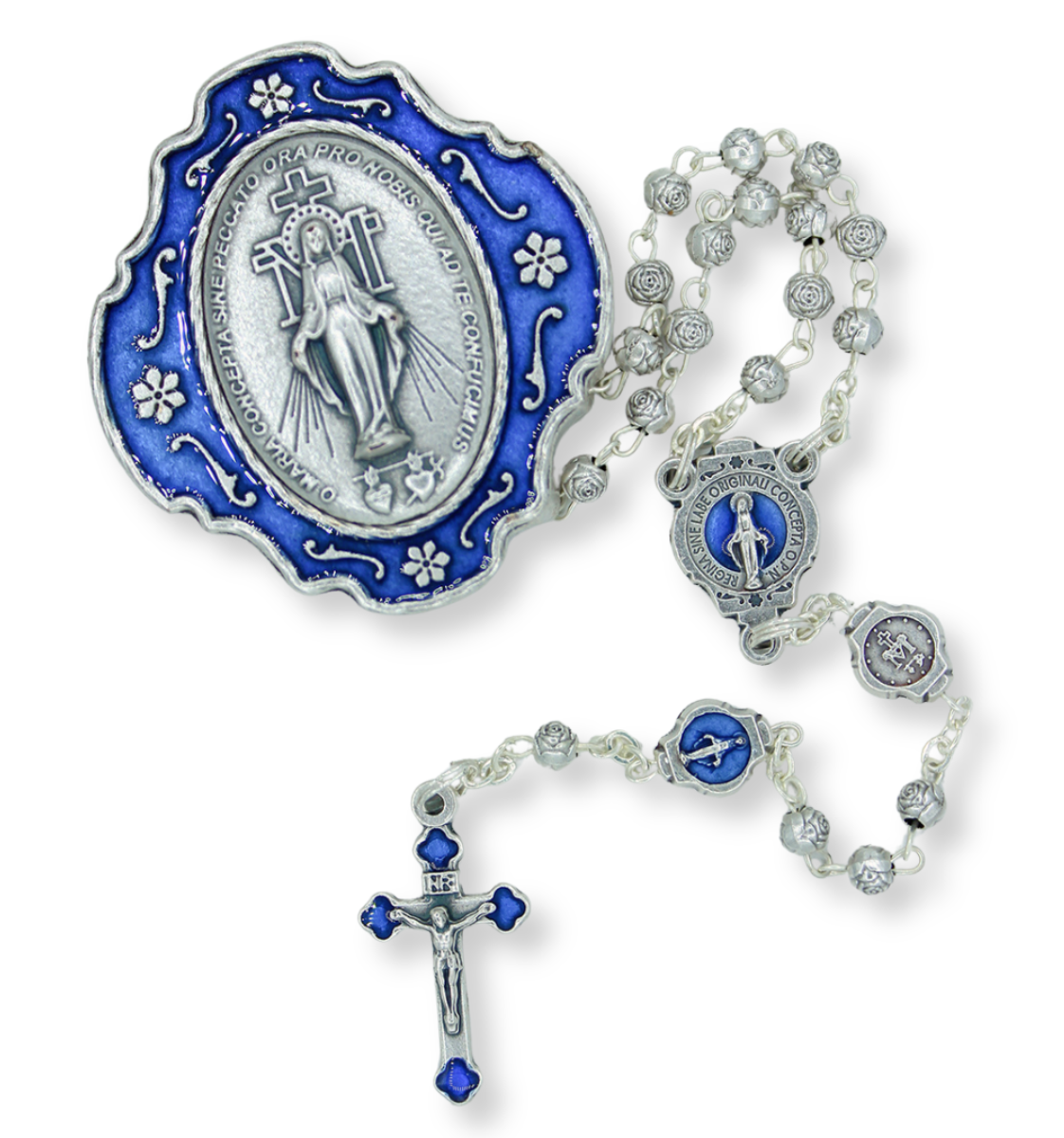 RC1360 - Miraculous Medal metal bead rosary with blue enamel accents. Comes with a beautiful silver oxidized metal case with blue enamel accents. Rosary Our Father beads feature the Miraculous Medal Image, and rosebud Hail Mary beads. This smaller rosary is 15" in overall length and made in Italy.