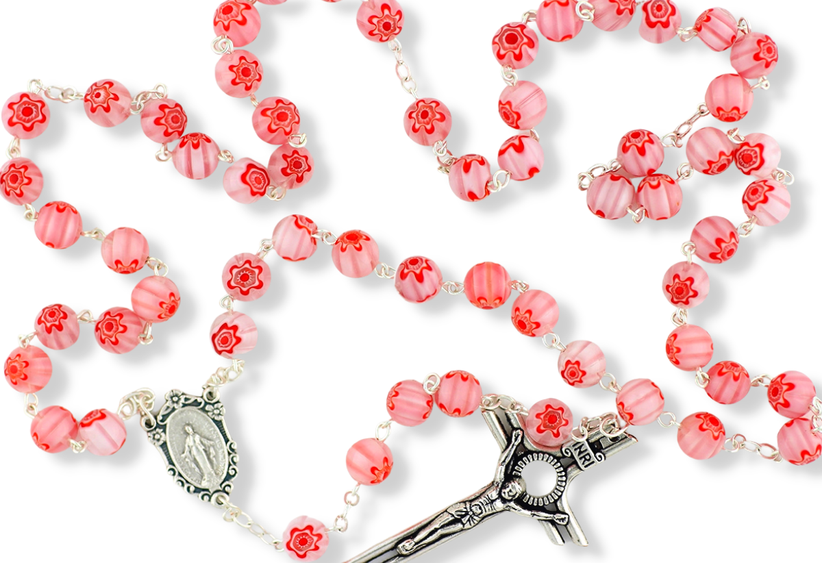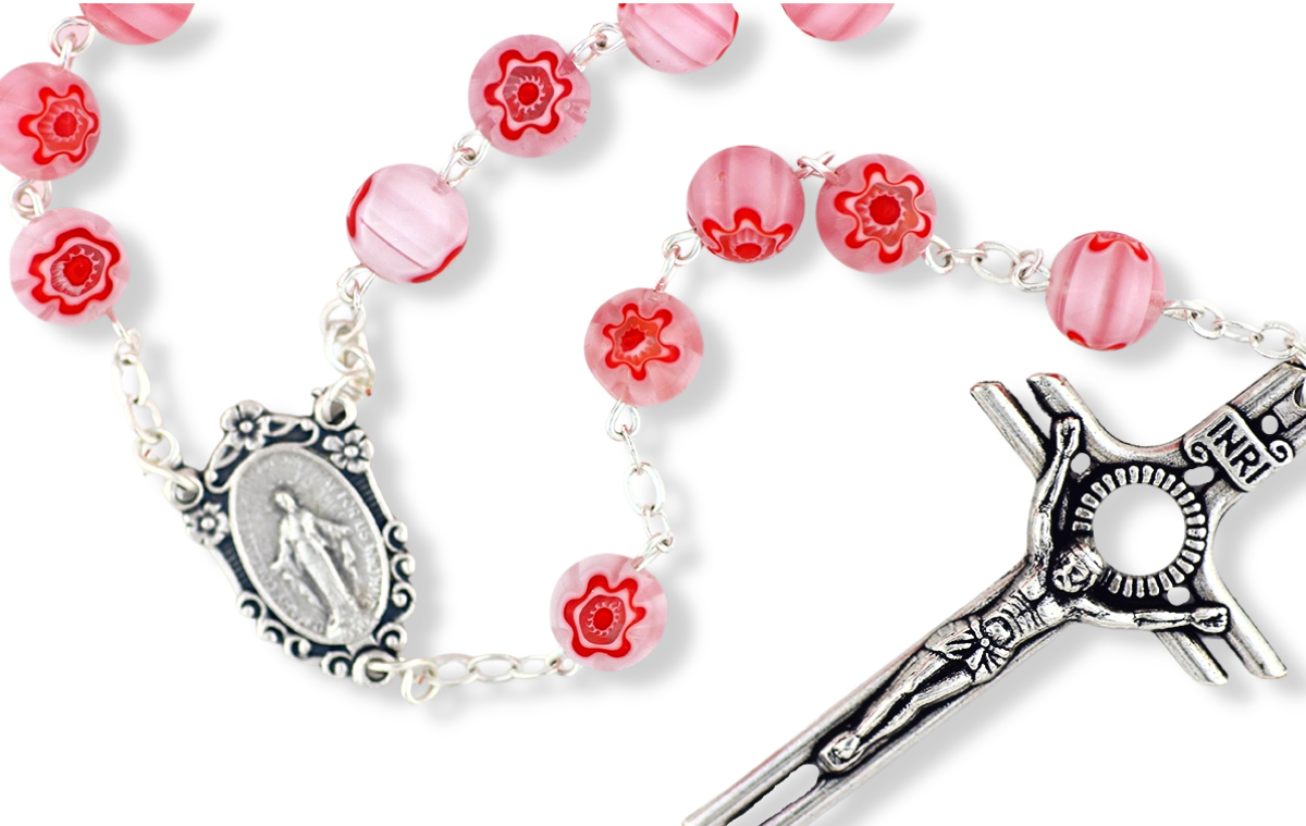 This classic rosary is beautifully detailed with handmade 8mm murano beads. The center piece features Mary of the Miraculous Medal. It is silver plated and made with durable locked link construction for extra strength. Measures 21 inches and is made in Portugal.