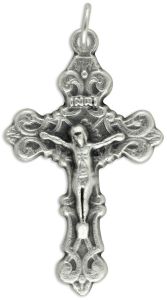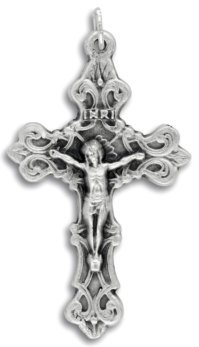 This beautiful Fleur-de-Lis crucifix features an ornate design and large size with wide crossbars. This crucifix is die-cast and silver oxidized for a rich dimensional finish as only the Italians have perfected. Made in Italy. Approximately 2 inches in height. Attached jump ring is included.
