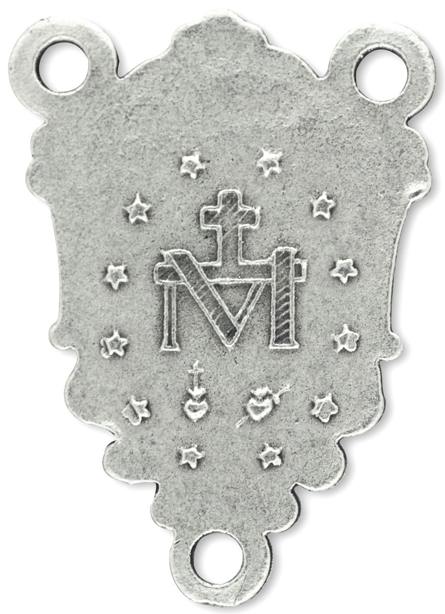 This ornate, nostalgic rosary center piece features a two-sided Miraculous Medal. 2.3 cm or 7/8 inch tall. Silver oxidized and made in Italy. Known as the Medal of the Immaculate Conception, created by St. Catherine Laboure following a vision of the Blessed Virgin Mary. This medal is believed to bring special intercessions on behalf of the Blessed Virgin Mary if worn with faith and devotion at the hour of death.