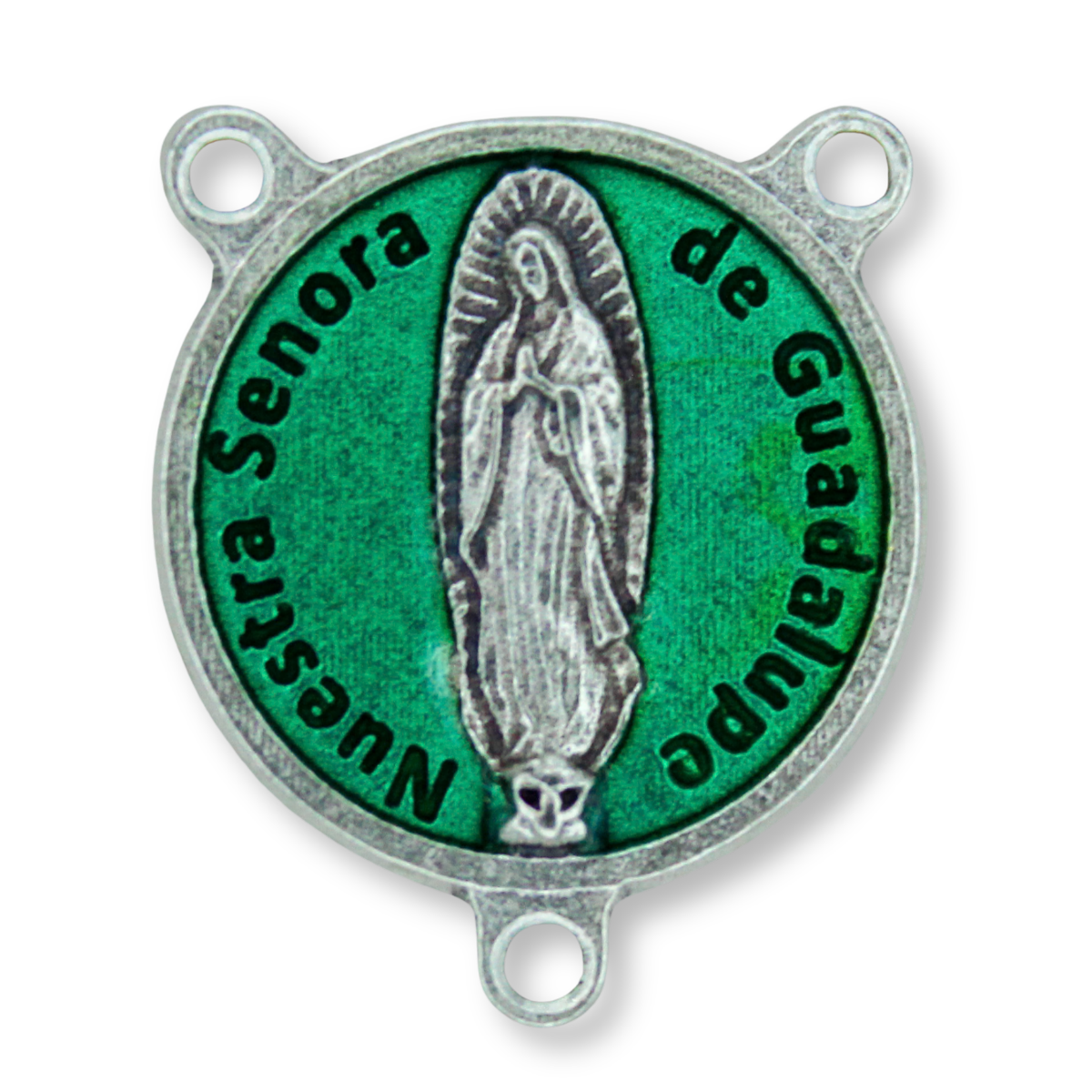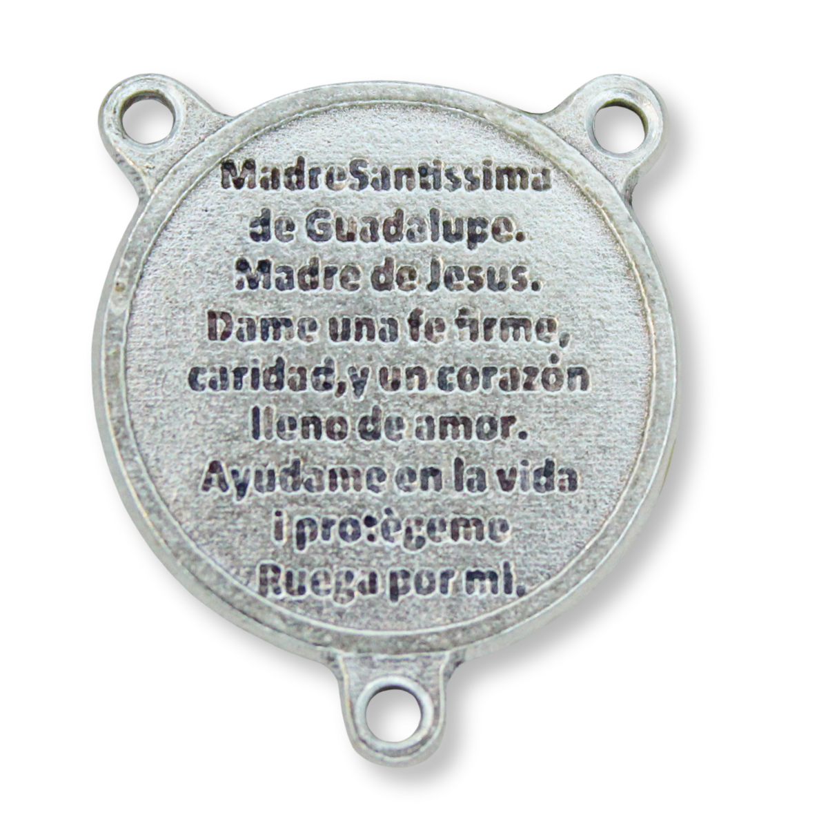 This rosary center piece from Italy is 3/4" in diameter and features Our Lady of Guadalupe, accented with green enamel, on the front, and inscribed with: "Madre Santissima de Guadalupe. Madre de Jesus. Dame una fe firme, caridad, y un corazon lieno de amor. Ayudame en la vida i protegeme Ruega por mi." on the back. These are silver oxidized rosary centerpieces.
