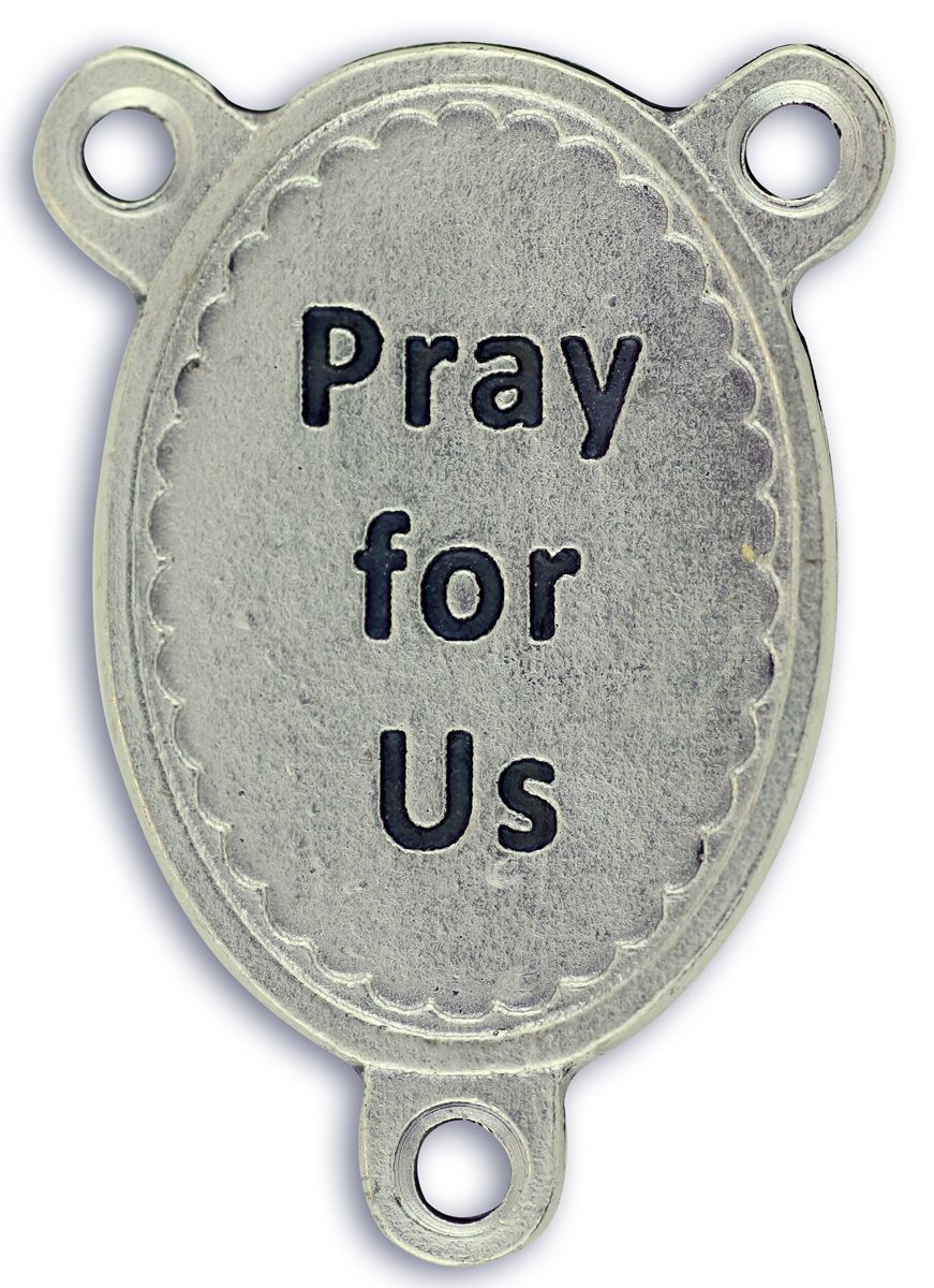 This beautifully designed centerpiece features two sides. The front shows an image of Our Lady of Guadalupe surrounded by a scalloped border. The back side has "Pray for Us" on it. The centerpiece is 1 1/8" tall and is made in Italy.