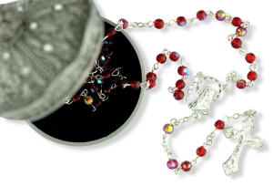 This beautiful set is made up of a 4mm pink rosary which measures 16 inches in length and comes with a beautiful highly detailed metal heart shaped rosary box with an embossed floral relief and black velvet lining. This case measures 2 1/4 " x 2 1/4" x 1 1/2".