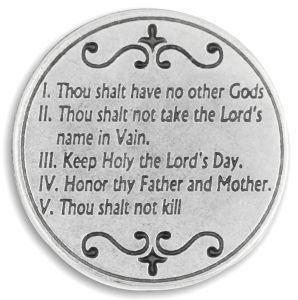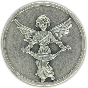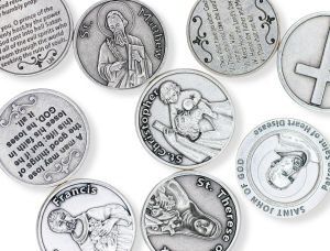Catholic pocket tokens with Jesus, Mary and the Saints, with inspirational messages. These top quality pocket coins are Italian made, silver plated, and beautifully detailed. Sized about the size of a silver dollar, they are great for carrying in your pocket or purse, or for giving as gifts!