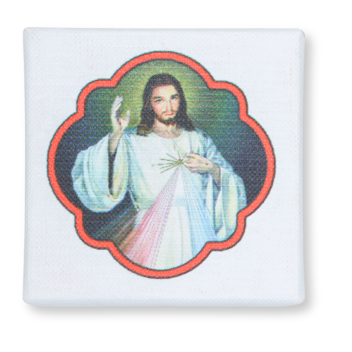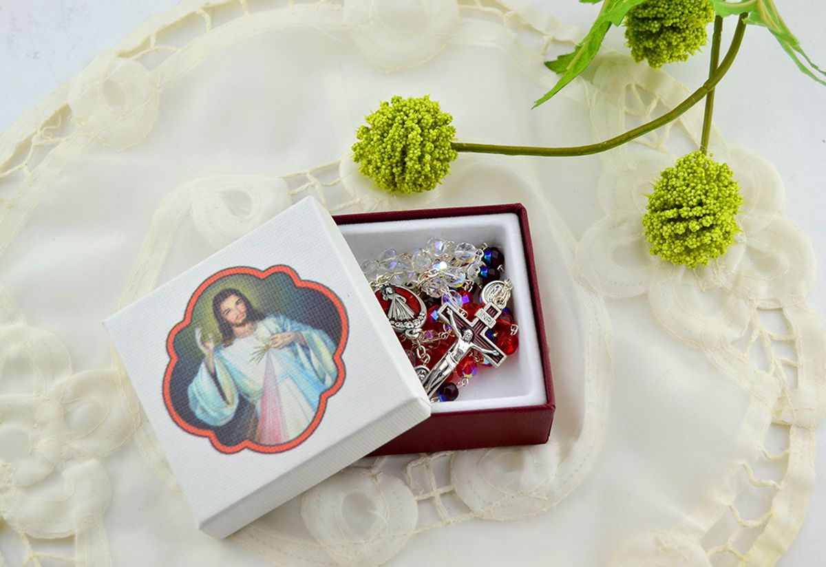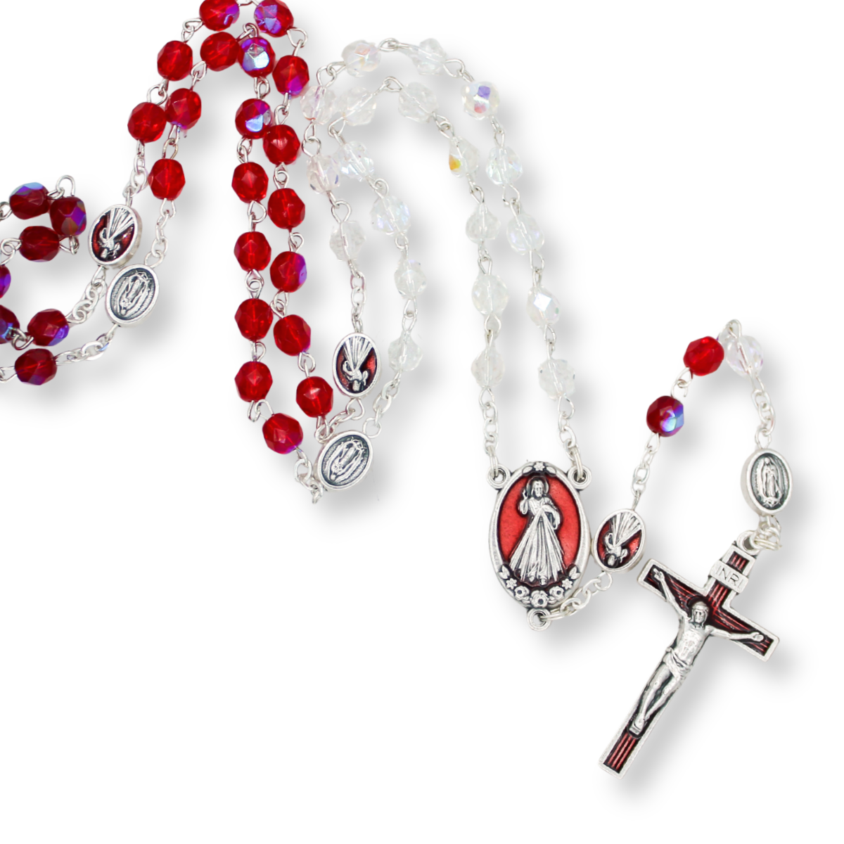 This beautiful rosary has a red enamel crucifix along and a red enamel centerpiece featuring the Divine Mercy Jesus. The Our Father beads are made with an image of Our Lady of Guadalupe on one side and Jesus on the other side. It has two different color crystal beads with chain link assembly. Measures 18" and was made in Italy.