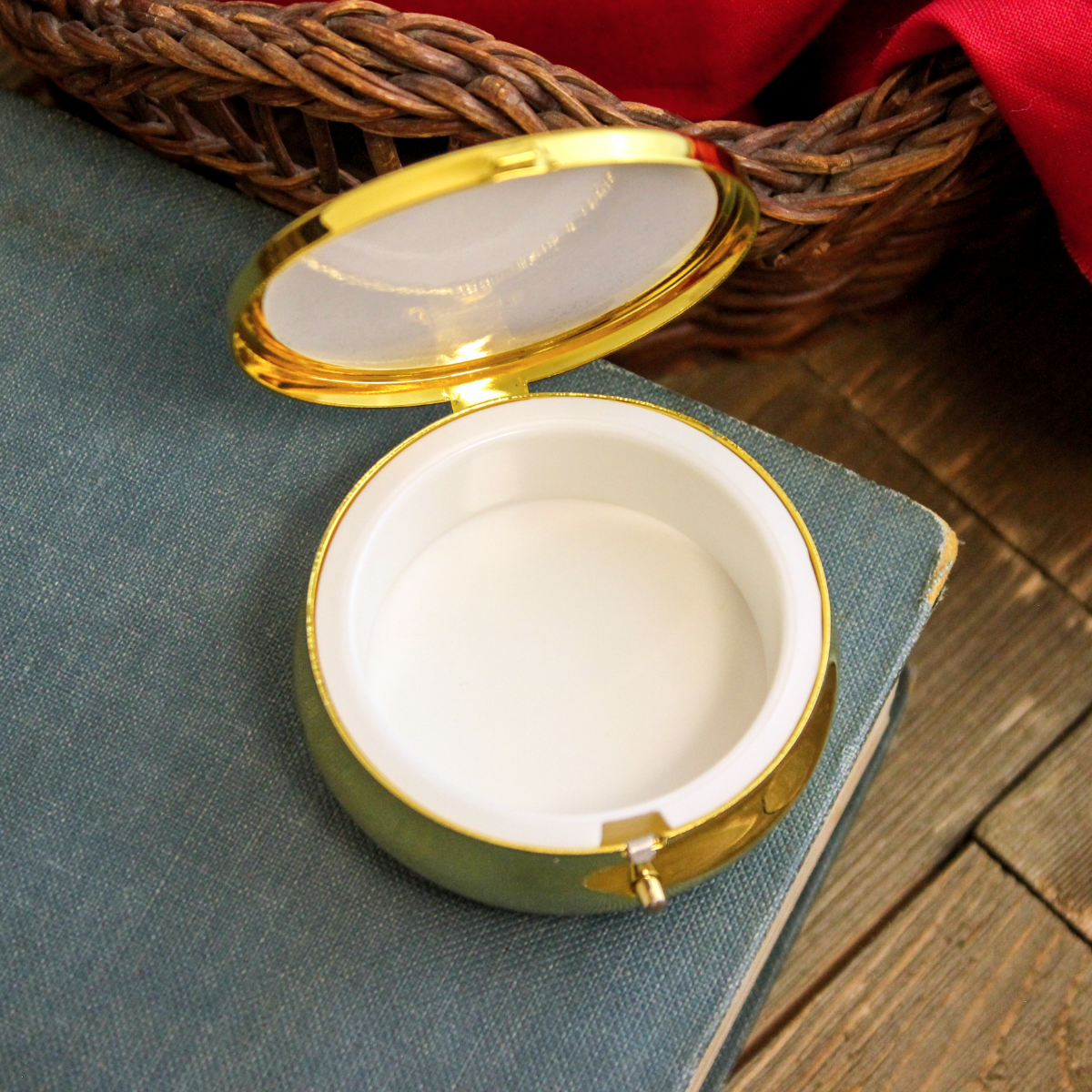 This beautiful handmade Italian Holy Communion pyx / rosary case features a detailed image of the Sacred Heart of Jesus, accented with gold- and silver-plated metal and red sparkly enamel. Measuring approximately 6 cm across and 2 cm high, with an inside diameter of 4 cm and a plastic liner, it may be used to carry Holy Communion to the sick (only if approved by your priest) or as a case for a small rosary or jewelry. Please use the pyx for only one purpose to remain respectful of the Eucharist, as some churches do not allow plastic-lined pyxes; in those cases, it serves as a safe and meaningful holder for a rosary or small personal items.