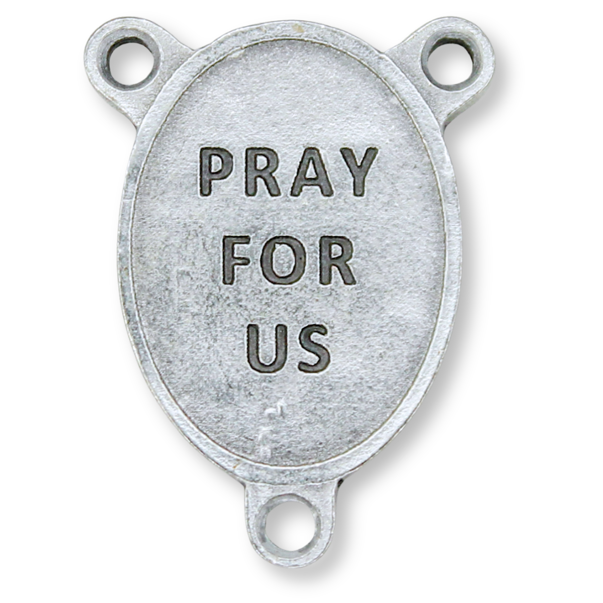 This rosary centerpiece features Saint Peregrine (patron saint of cancer patients), accented with blue enamel, on the front and "Pray for Us" on the back. Measures approximately 1" in height. Nicely detailed with raised relief. Silver plated, made in Italy.