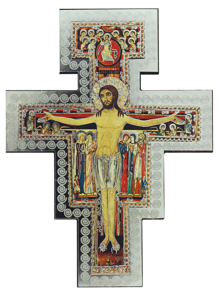 This unique cross is 9 1/2 inches tall by 7 inches wide. The silver foil along with the painted wooden image is beautifully displayed to make the cross come alive. The center image of the Crucified Christ is nicely displayed in full color. Comes ready to hang with a bracket at the top of the back.