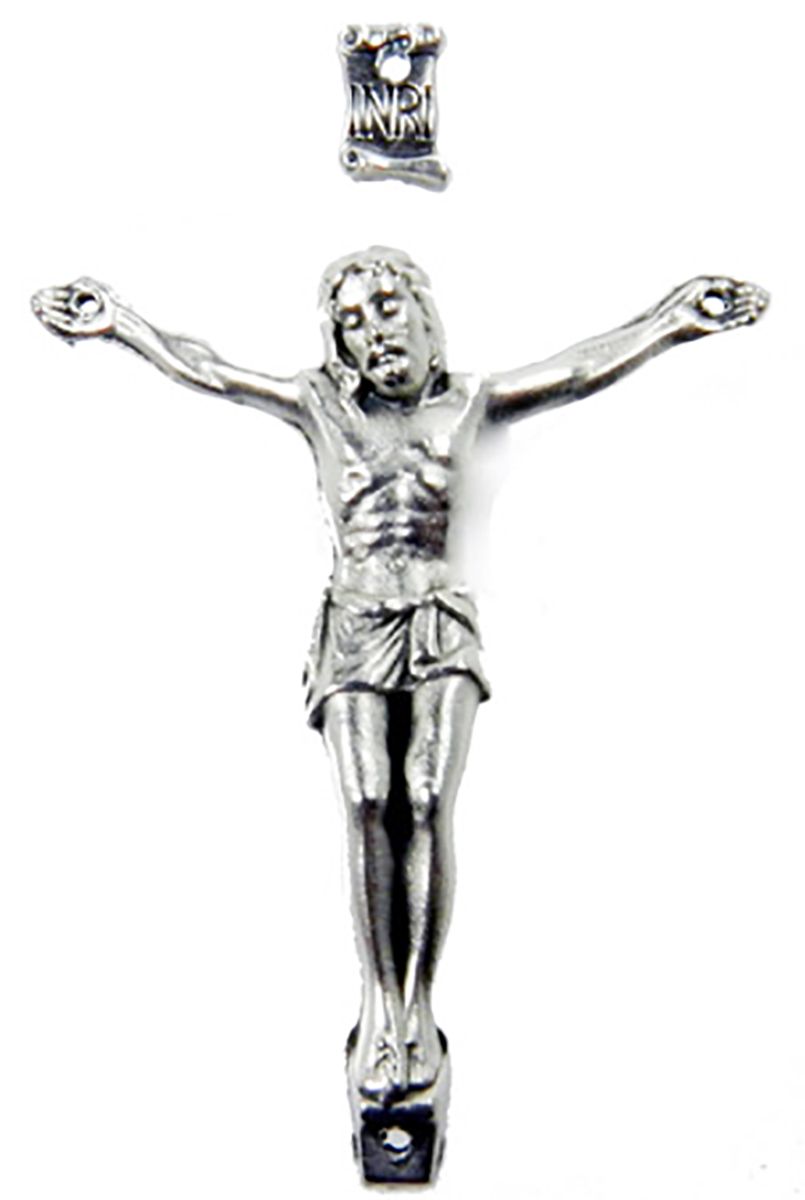 This beautifully detailed corpus comes with an INRI sign ready to attach to a cross. The corpus measures just over 1.5 Inches (4cm) in height x 1-1/4"(3.5cm) in width. The INRI sign measures .4"(1cm) x 5/16"(5mm). Both the corpus and sign come complete with pre-drilled 2mm holes. Silver oxidized and imported from Italy. Each corpus is die cast from metal with beautiful detail and quality. As a general guideline, the cross should be approximately 2 times the height of the corpus, but this can vary significantly depending on your personal preference. Corpora can be attached with small nails / brads that you can find at any hardware store or home improvement warehouse (you can choose the type you want depending on the look you would like). Hot melt adhesive can also be used, optionally, in addition to the nails if desired.