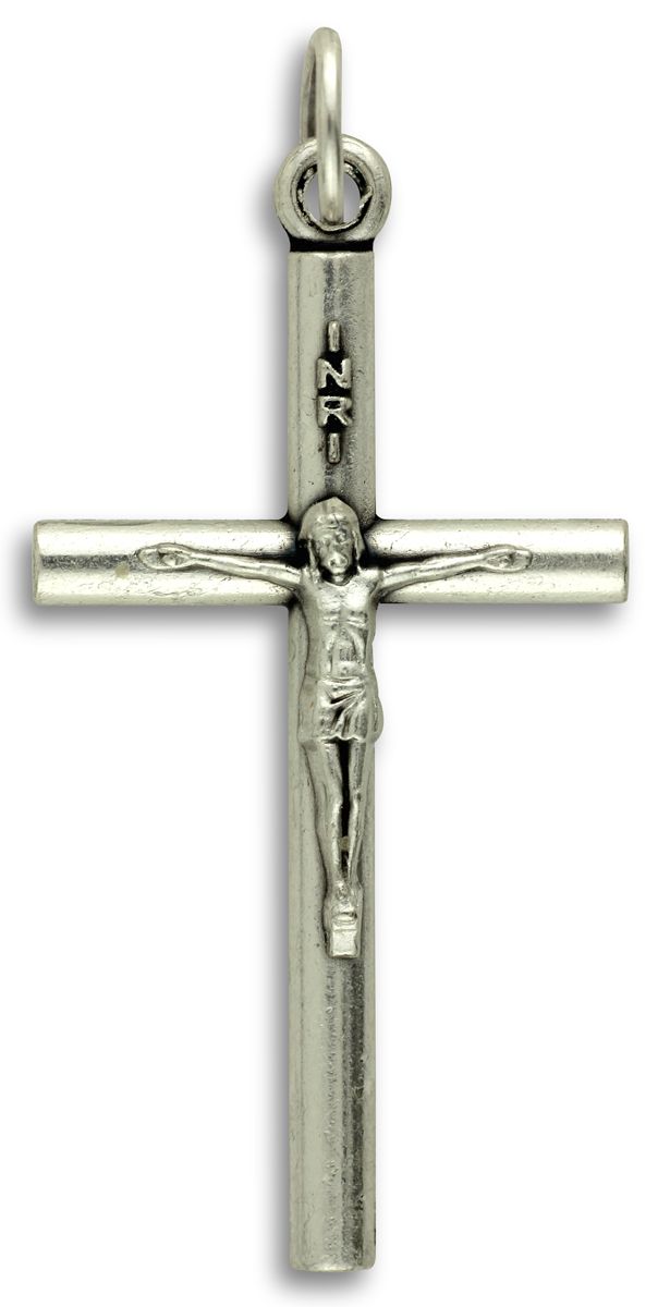 This simple crucifix is basically two, thin metal cylinders joined together a plain, yet beautiful crucifix. It measures 1 1/8 inches. Crucifix is die cast and silver oxidized. Comes with jump ring included and attached.