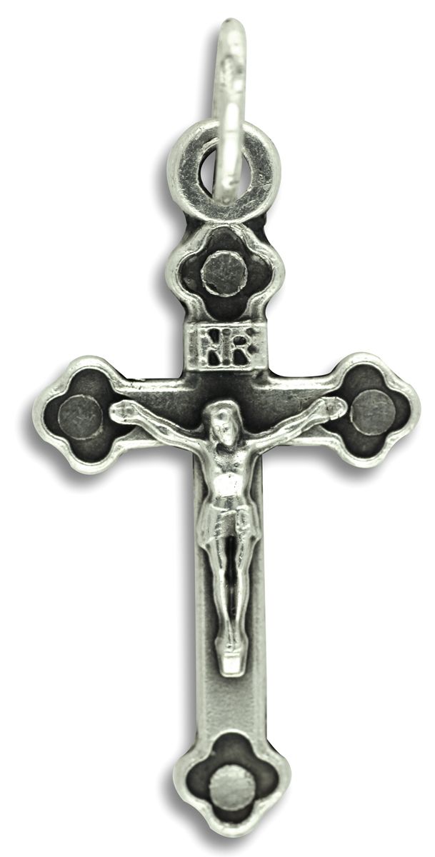 This small beautifully detailed crucifix features flared edges and nice designs at he ends of the cross. Made in Italy and silver oxidized. This smaller crucifix is 1 1/8" (2.6 cm) in height.