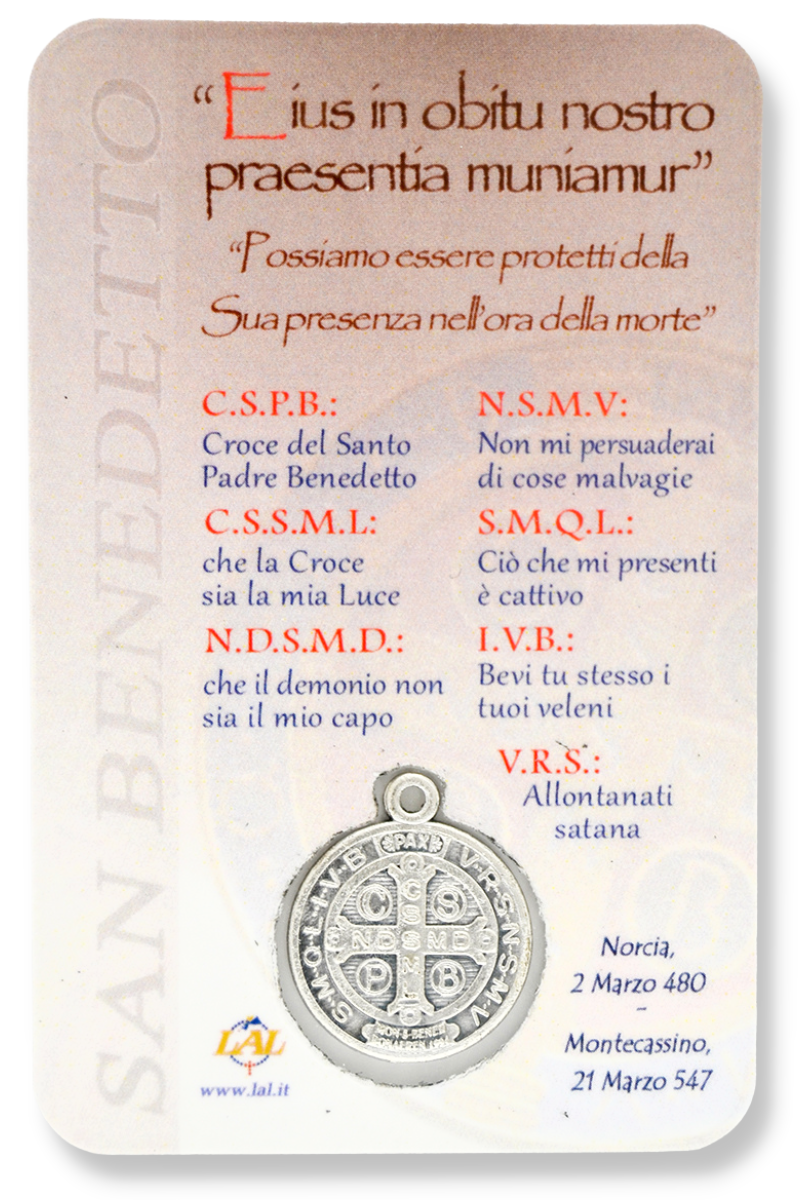 This custom card is laminated for long lasting durability and has a St Benedict Medal on the inside. Printed in Spanish, it serves as protection against evil and temptation, secures a timely and healthy birth for children as well as protection against body afflictions and contagious diseases. St Benedict is the patron saint of Kidney disease and schoolchildren. This medal is also known as the medal of a happy death. Measures at 3.5" tall by 2.25" wide, making it a perfect fit to carry inside a wallet, pocket, or purse. Made in Italy.