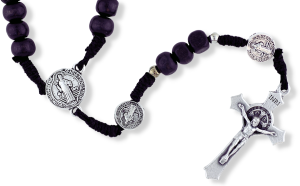 This rosary has dark brown wood beads with a St Benedict center, crucifix and Our Father metal beads. Most widely known for his intercessory protection from the devil, this rosary featuring St. Benedict's Medal is one of the most powerful in our Catholic Faith. Measures 16 inches and is made in Italy.
