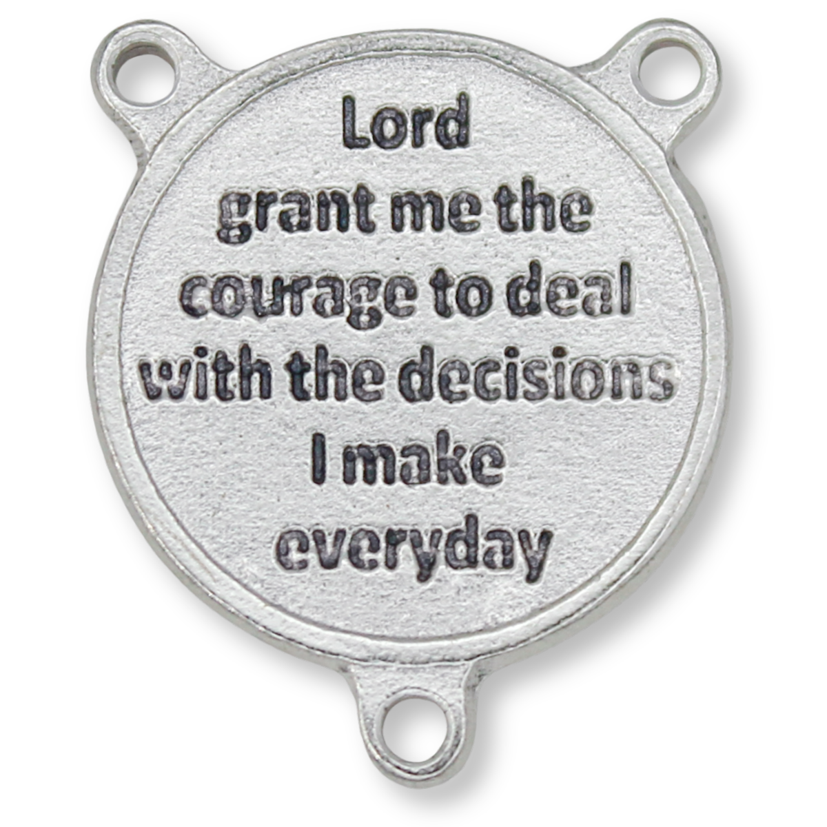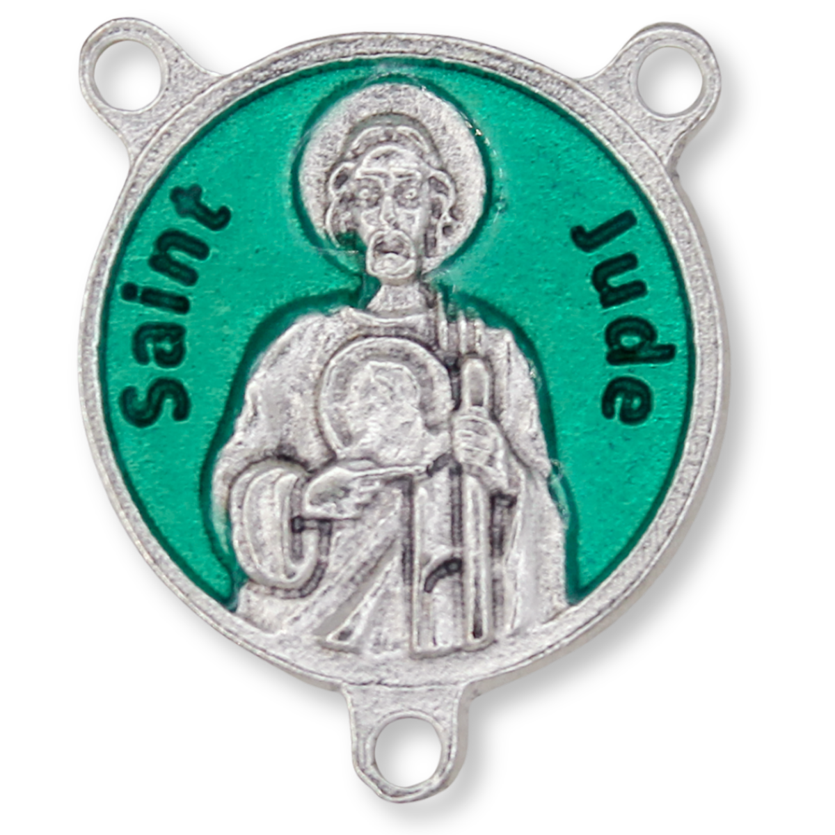 This rosary center piece from Italy is 3/4" in diameter and features St. Jude, accented with green enamel, on the front, and inscribed with: "Lord, grant me the courage to deal with the decisions I make everyday." on the back. These are silver oxidized rosary centerpieces.
