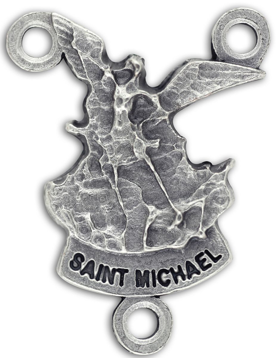 This uniquely-shaped rosary center piece depicts Saint Michael defeating Satan. St. Michael is the patron saint of those who are ill and those who work in dangerous professions such as military and police personnel, paramedics and mariners. Made in Italy, this rosary centerpiece features a silver-oxidized finish that adds depth and intricate detail. It measures 7/8 inch and is made in Italy.
