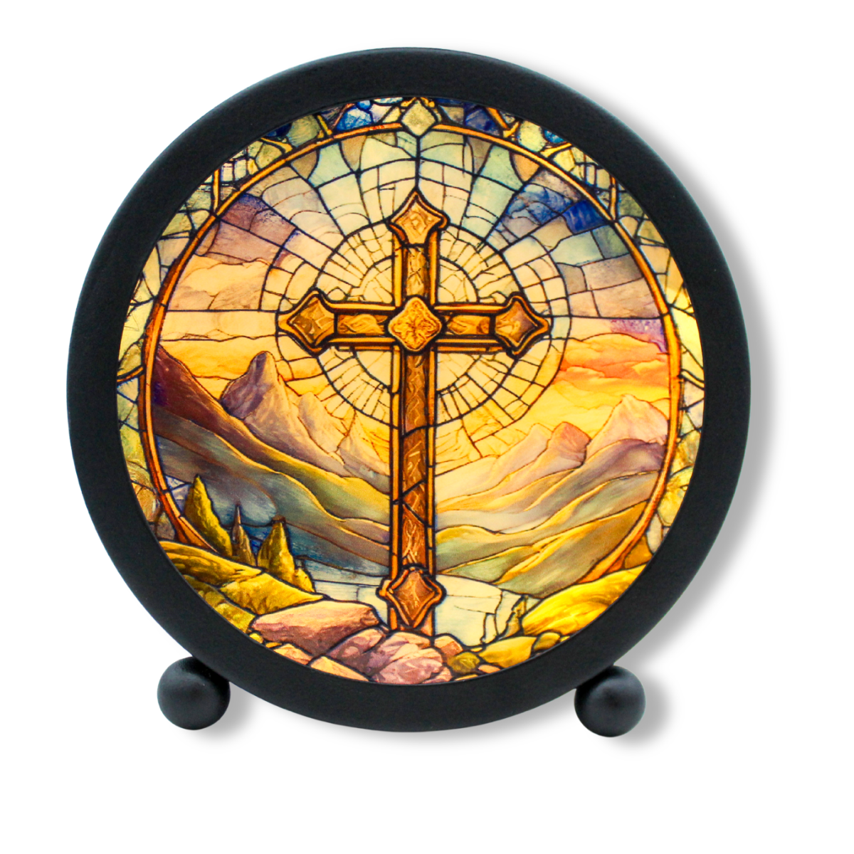 This stained glass cross tabletop décor brings a quiet sense of faith and reflection to any space. The design features a cross set within a peaceful landscape, creating a simple yet meaningful focal point. Measuring 4-1/2" in diameter, it is made from metal and glass for a sturdy, lasting finish. Powered by 3 AAA batteries (not included), the soft internal light highlights the details of the stained glass. Suitable for a shelf, table, or nightstand, this piece offers a subtle expression of faith and comfort in the home.
