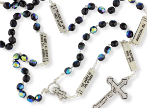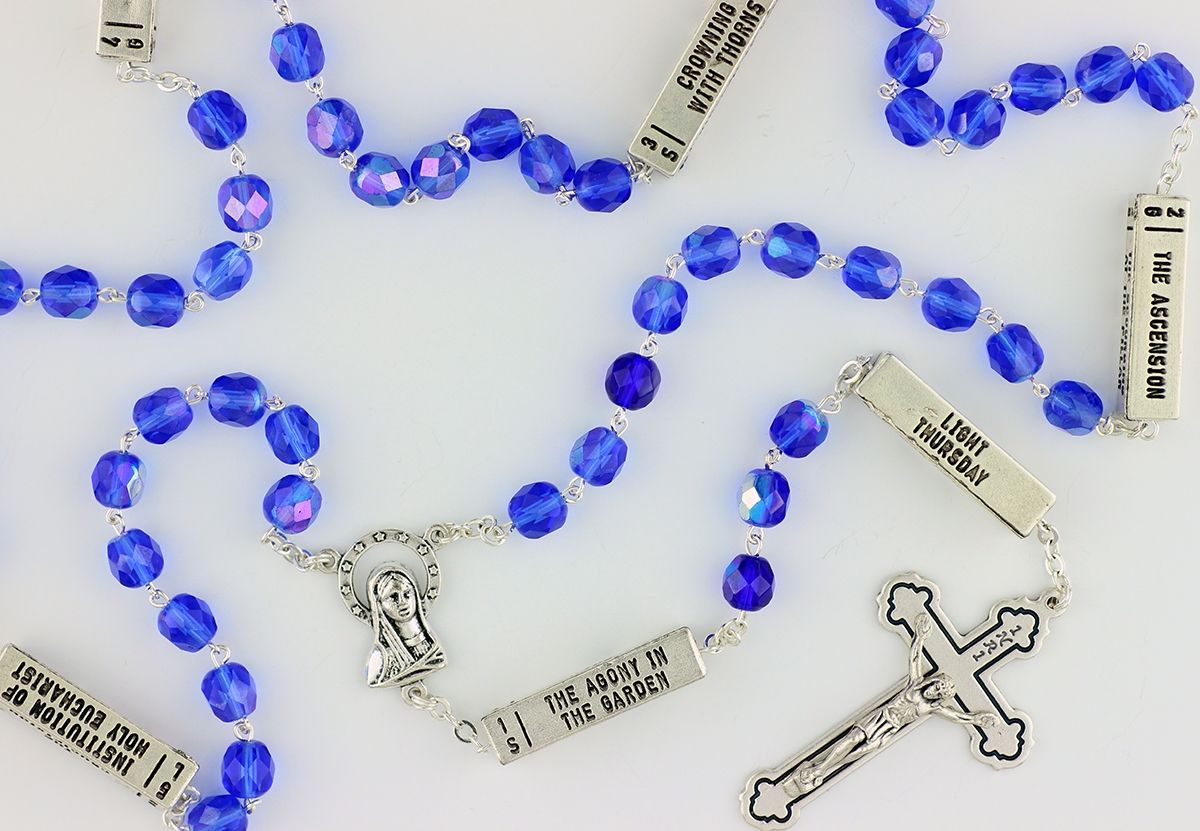 The Mysteries Rosary is designed to help focus our prayer on the life and death of Jesus from the Annunciation to the Ascension and beyond. Each set of mysteries allows us to ponder very specific events in the lives of Jesus and Mary. Made up of 8 mm blue crystal beads and engraved metal mystery bars tell you which set to recite on which day. It features a Blessed Mother center piece with the Sacred Heart of Jesus on the back and a byzantine style crucifix. Rosary measures approximately 22 inches and is made in Italy.