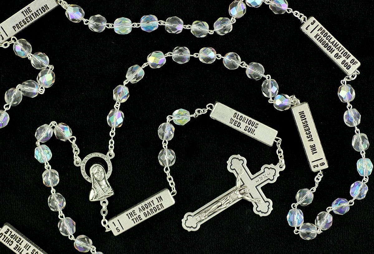 The Mysteries Rosary is designed to help focus our prayer on the life and death of Jesus from the Annunciation to the Ascension and beyond. Each set of mysteries allows us to ponder very specific events in the lives of Jesus and Mary. Made up of 8 mm crystal beads and engraved metal mystery bars tell you which set to recite on which day. It features a Blessed Mother center piece with the Sacred Heart of Jesus on the back and a byzantine style crucifix. Rosary measures approximately 22 inches and is made in Italy.